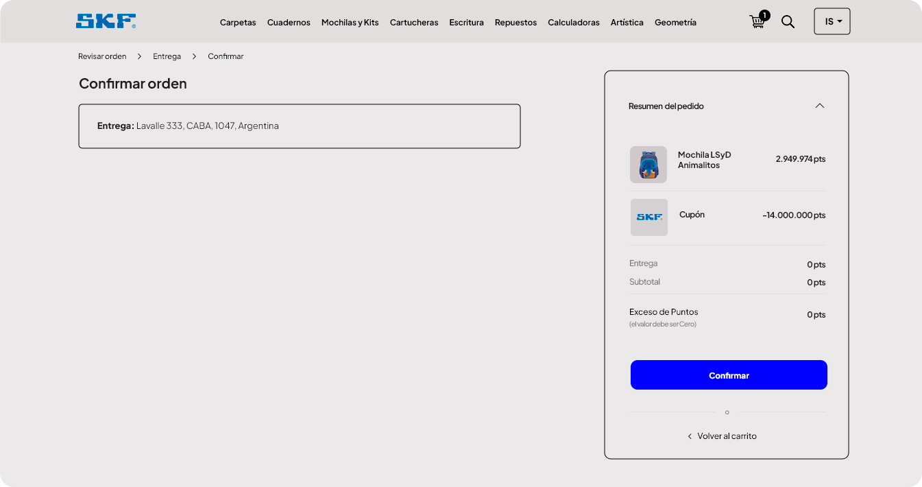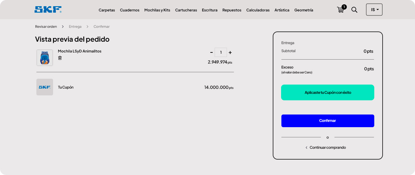 La próxima pantalla muestra el resumen final de tu pedido, haciendo clic en el botón "Confirmar" habrás finalizado con éxito el proceso de canje de tus útiles escolares.