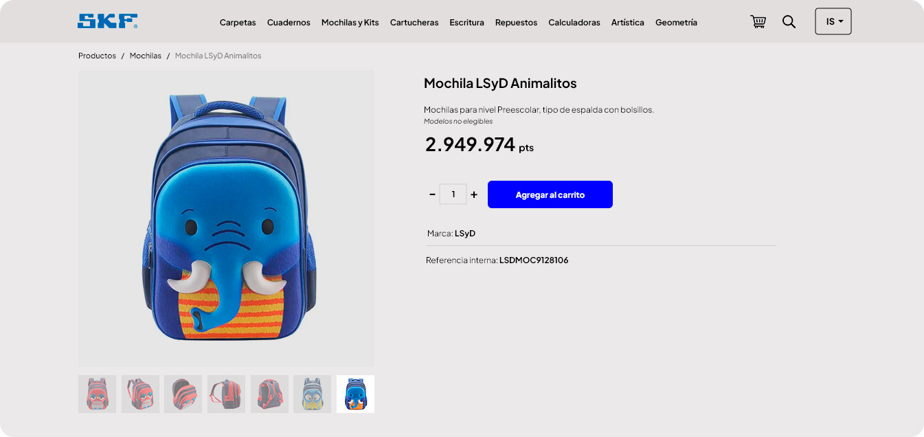 Al hacer clic en un producto de la lista accedés al detalle de estos con su valor en puntos, descripción y la posibilidad de elegir la cantidad para finalmente cargar al carrito desde el botón "Agregar al carrito". También cuenta con imágenes que podrás ampliar.