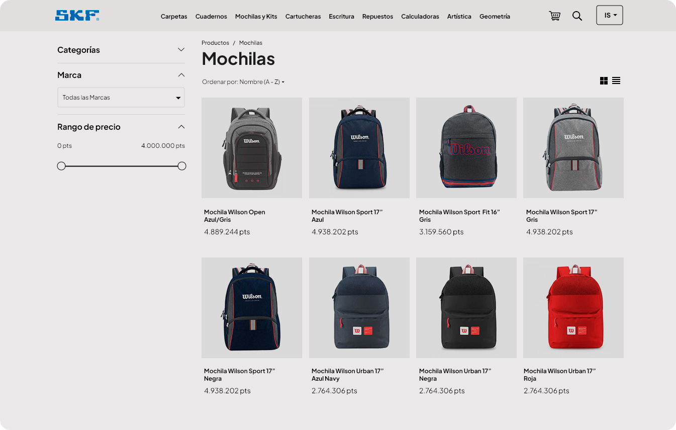 Haciendo clic en cualquiera de las Categorías del menú accederás a la lista completa de los productos agrupados en la misma. Podés filtrar tu búsqueda mediante las sub-categorías que se despliegan en el menú de la columna derecha, añadir productos de la lista a tu carrito a través del botón "Agregar al carrito" o bien ingresar en el detalle del producto haciendo clic en cada uno.